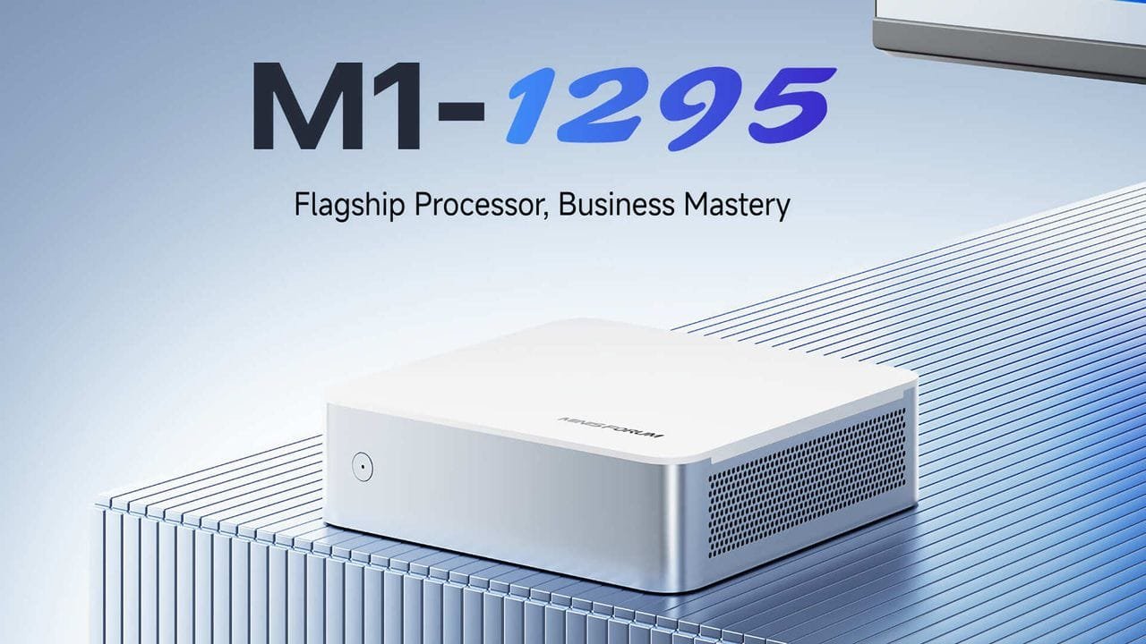 Minisforum M1-1295 combines minimalist design and Intel power, hiding all ports at the back for a cleaner workstation aesthetic.